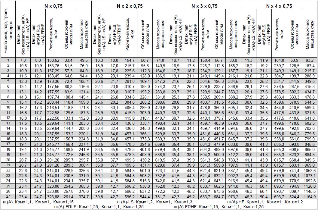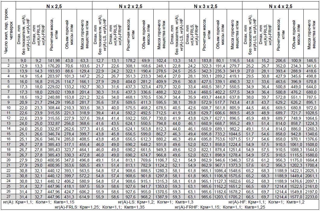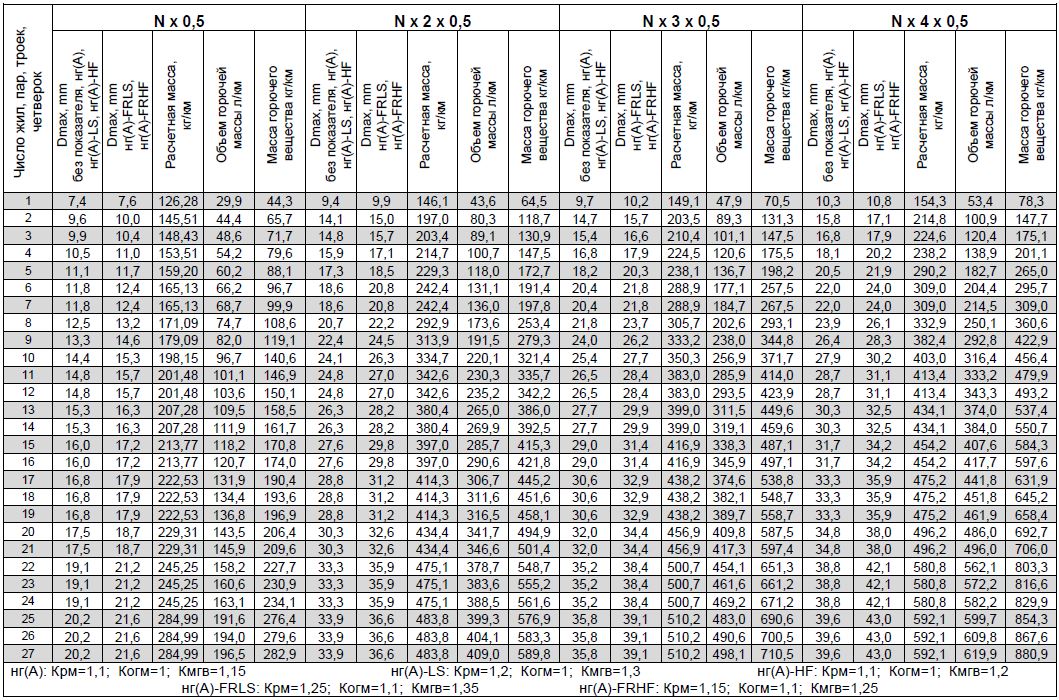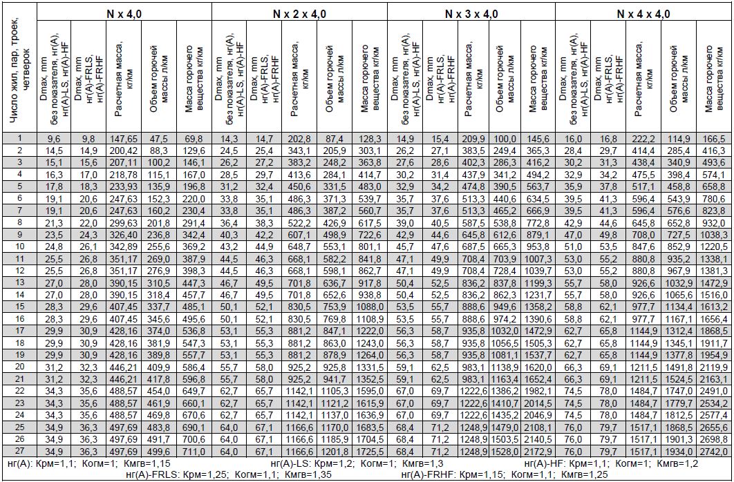 При работе с таблицей следует учитывать, что показатели приведены для кабелей с экранами, выполненными из фольгированного материала, расчетная масса, объем горючей массы и масса горючего вещества приведены в таблице для кабелей общепромышленного исполнения, не распространяющих горение при одиночной прокладке (без обозначения показателя пожарной опасности).