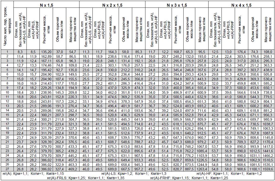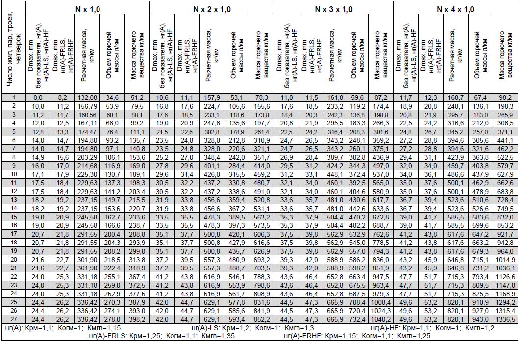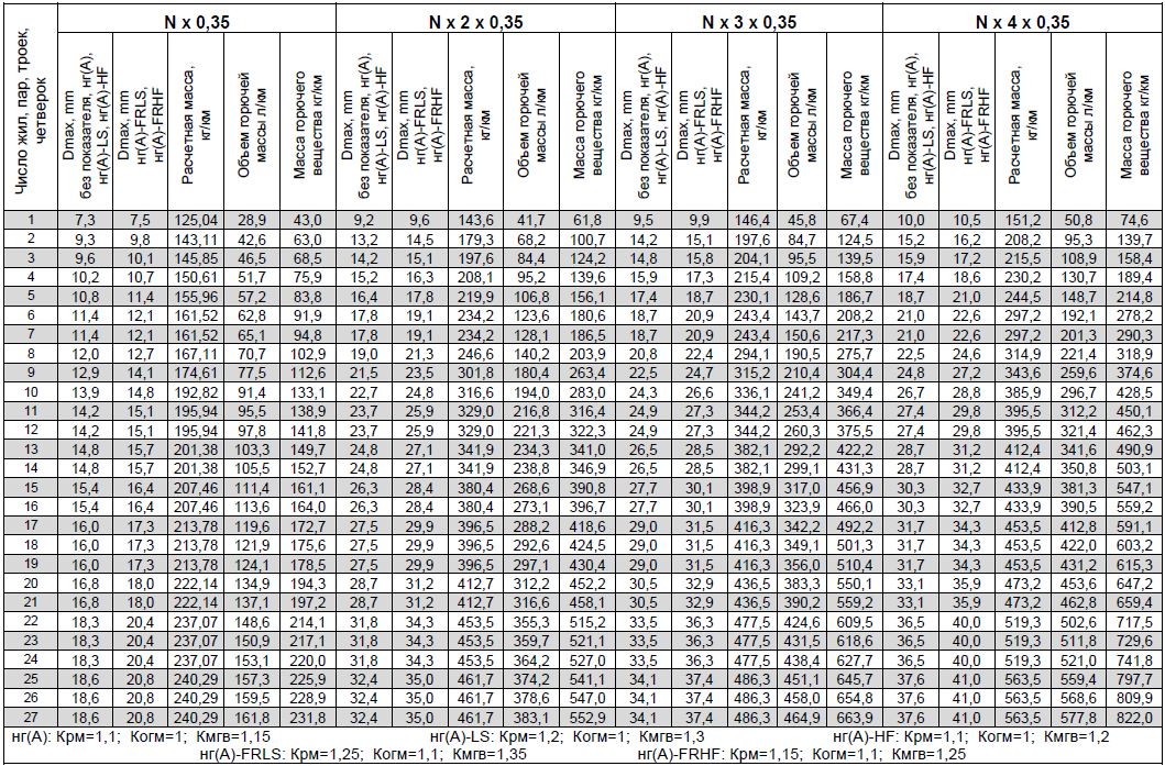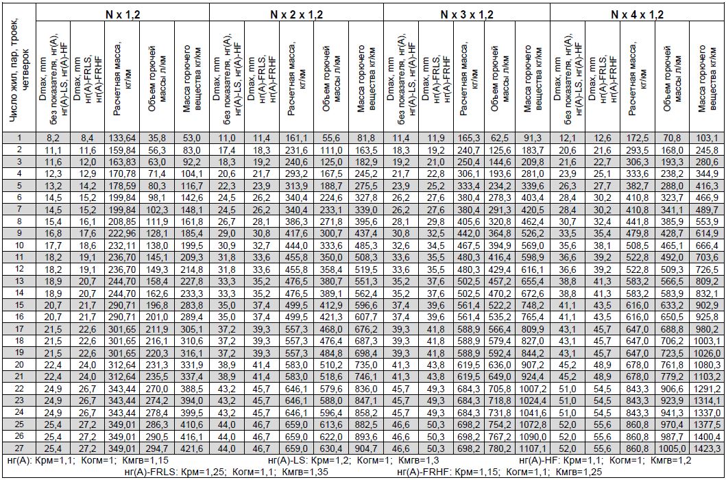Определение величин показателей для кабелей в различных исполнениях по пожарной безопасности следует производить умножением базового показателя на соответствующий коэффициент: