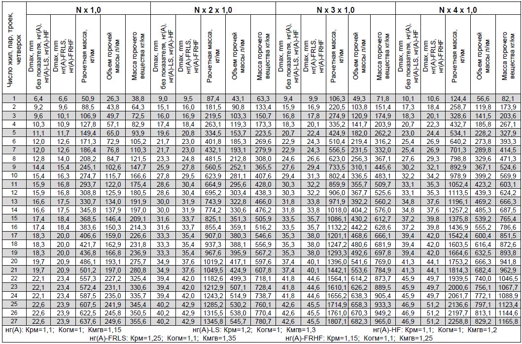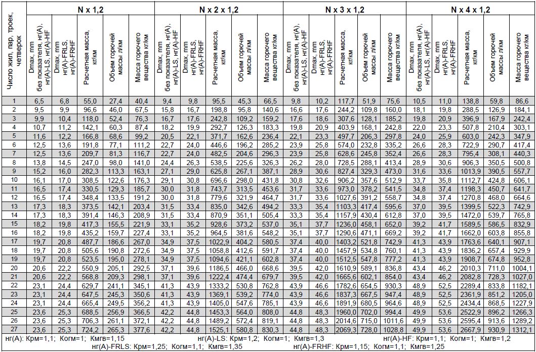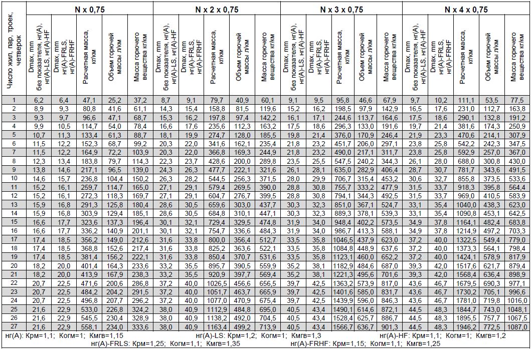 Определение величин показателей для кабелей в различных исполнениях по пожарной безопасности следует производить умножением базового показателя на соответствующий коэффициент: