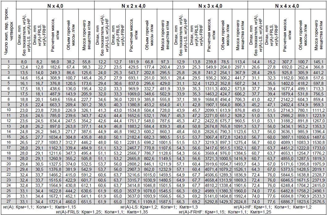При работе с таблицей следует учитывать, что показатели приведены для кабелей с экранами, выполненными из фольгированного материала, расчетная масса, объем горючей массы и масса горючего вещества приведены в таблице для кабелей общепромышленного исполнения, не распространяющих горение при одиночной прокладке (без обозначения показателя пожарной опасности).