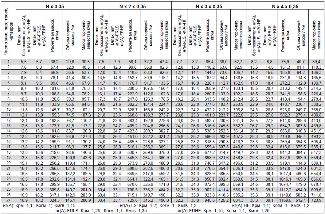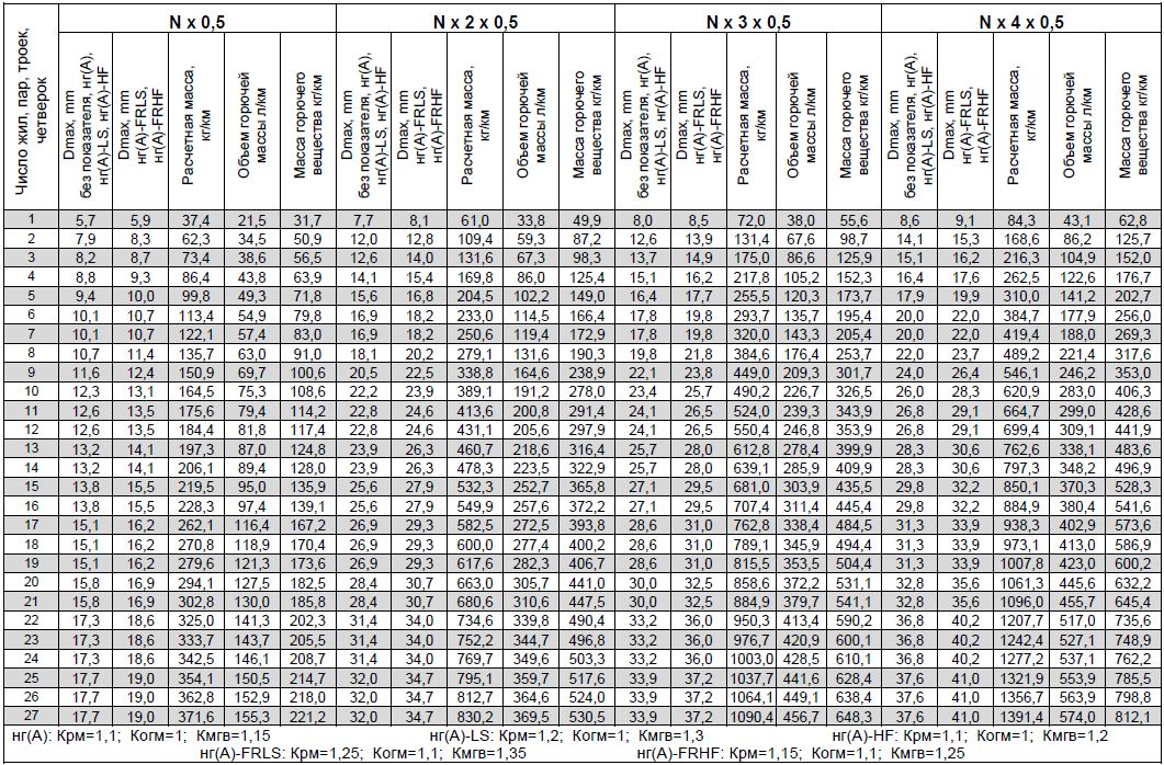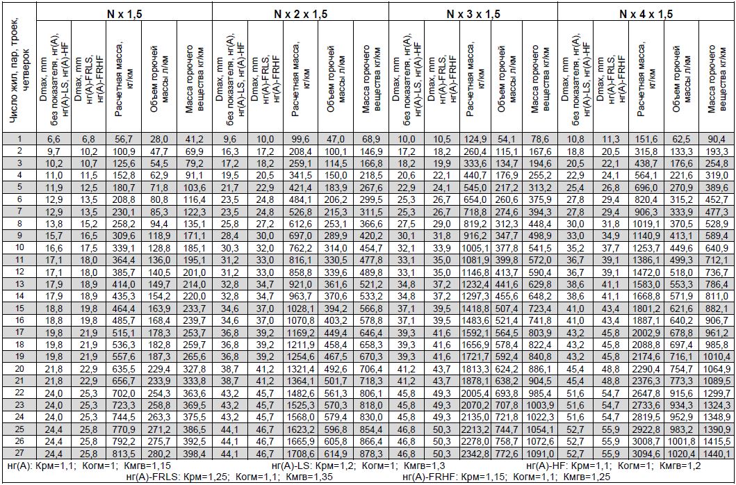 При работе с таблицей следует учитывать, что показатели приведены для кабелей с экранами, выполненными из фольгированного материала, расчетная масса, объем горючей массы и масса горючего вещества приведены в таблице для кабелей общепромышленного исполнения, не распространяющих горение при одиночной прокладке (без обозначения показателя пожарной опасности).