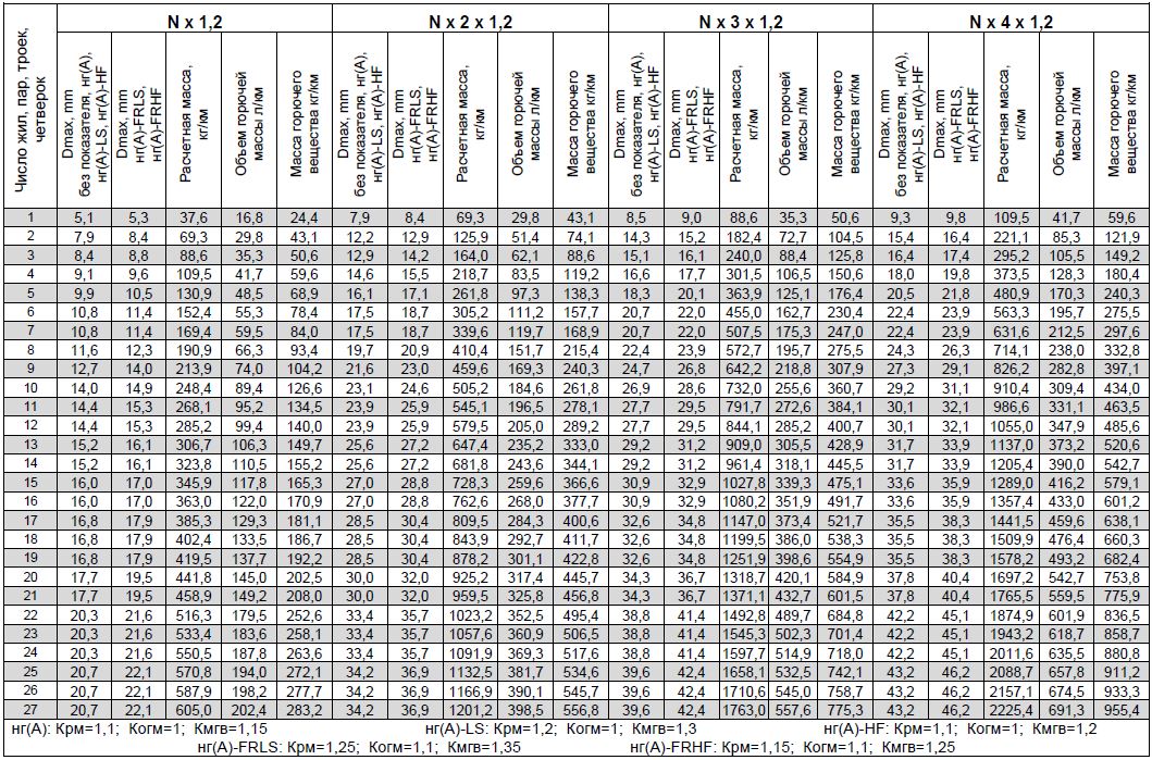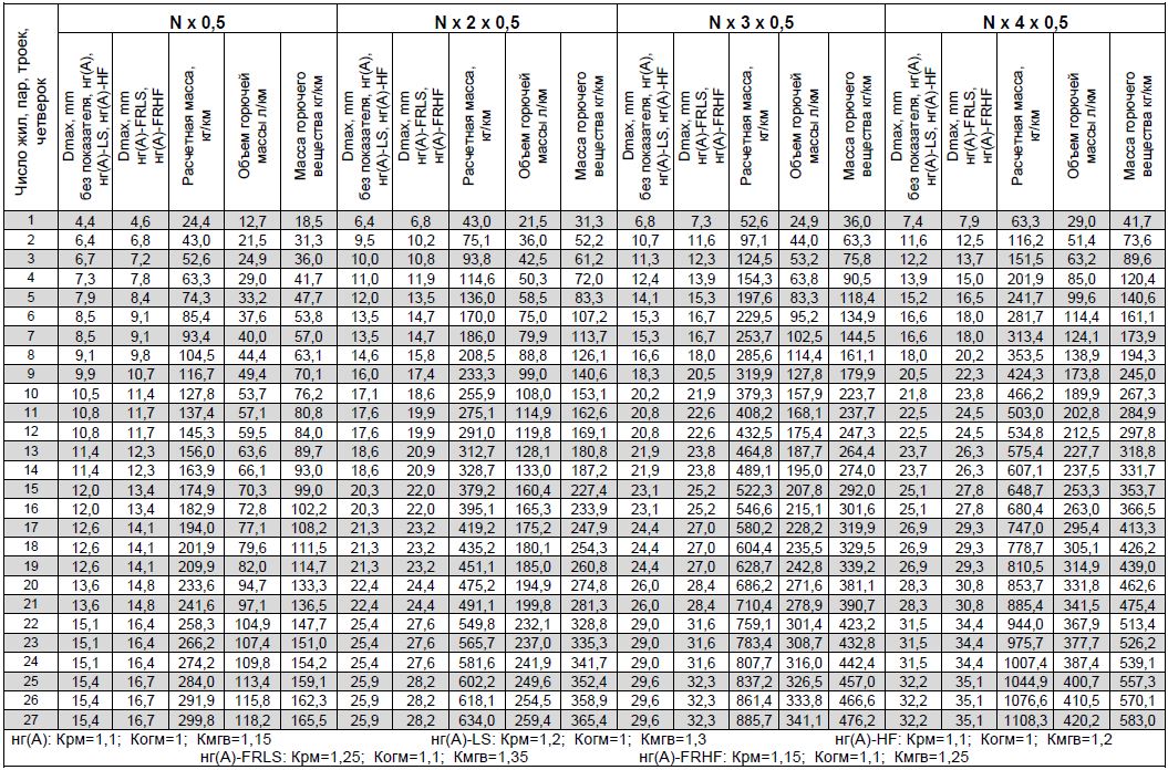 При работе с таблицей следует учитывать, что показатели приведены для кабелей с экранами, выполненными из фольгированного материала, расчетная масса, объем горючей массы и масса горючего вещества приведены в таблице для кабелей общепромышленного исполнения, не распространяющих горение при одиночной прокладке (без обозначения показателя пожарной опасности).