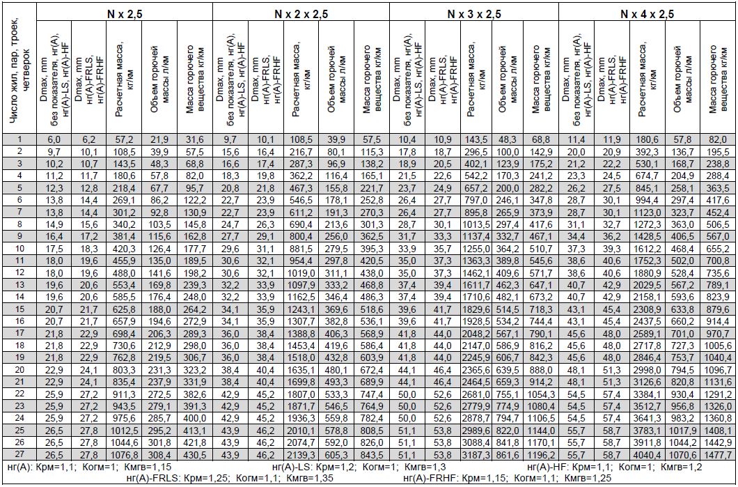 Определение величин показателей для кабелей в различных исполнениях по пожарной безопасности следует производить умножением базового показателя на соответствующий коэффициент: