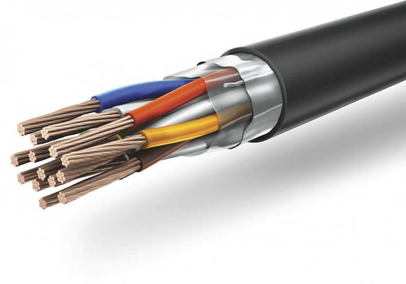 Кабель с многопроволочными токопроводящими жилами из медных луженых проволок, с изоляцией и оболочкой из полимерных компаундов, не содержащих галогенов, не распространяющий горение при групповой прокладке по категории А и не выделяющий коррозионно-активных газообразных продуктов при горении и тлении, с общим экраном из фольгированного материала, без брони.