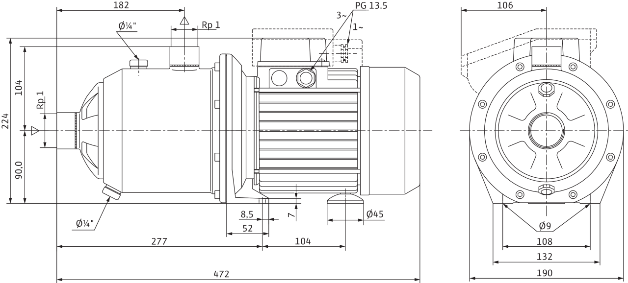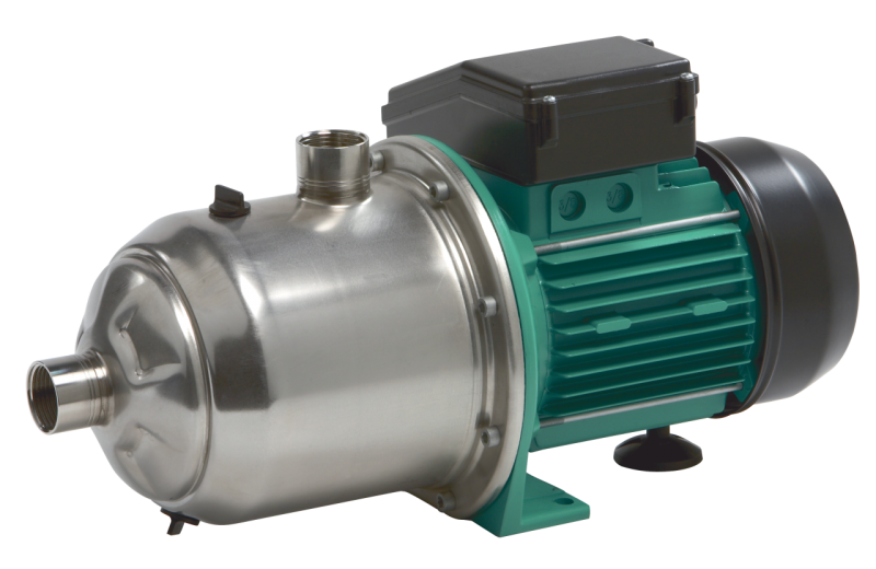 Многоступенчатый самовсасывающий горизонтальный высоконапорный центробежный насос блочного типа с низким уровнем шума с горизонтальным всасывающим и вертикальным напорным патрубком. Гидравлический всасывающий тракт нового типа. Со сквозным насосным валом электродвигателя и не зависящим от направления вращения скользящим торцовым уплотнением. Напрямую присоединенный фланцами однофазный или трехфазный электродвигатель.