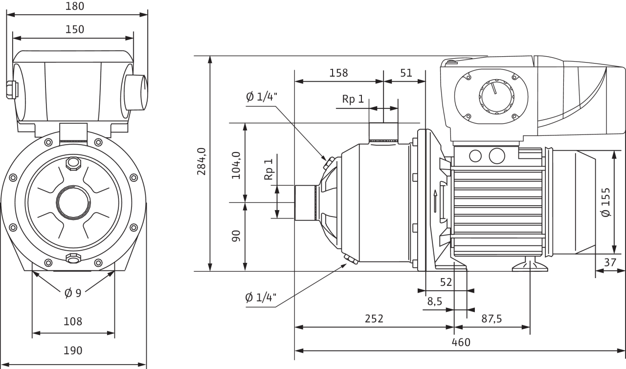 Многоступенчатый нормальновсасывающий горизонтальный высоконапорный центробежный насос блочного типа с горизонтальным всасывающим и вертикальным напорным патрубком и встроенным частотным преобразователем с воздушным охлаждением. Встроенный частотный преобразователь позволяет осуществлять плавную регулировку частоты вращения.