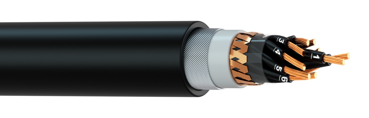 Кабель термостойкий, с десятью парами медных токопроводящих жил сечением 1,0 мм2, с изоляцией из термопластичного эластомера, с индивидуальными экранами пар из медных луженых проволок, с общим комбинированным экраном из ленты типа «Алюмофлекс» и медных луженых проволок, с броней из стальных оцинкованных проволок, с оболочкой из термопластичного эластомера синего цвета, для применения в искробезопасных цепях.