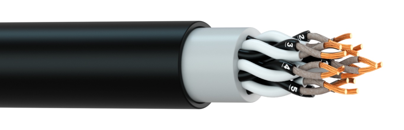 Кабель огнестойкий, с пятью парами токопроводящих жил сечением 1,0 мм2 из медных луженых проволок, с изоляцией из сшитого полиолефина, с оболочкой из безгалогенной композиции, стойкой к воздействию ультрафиолета, масел и бензина