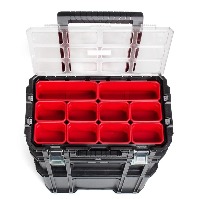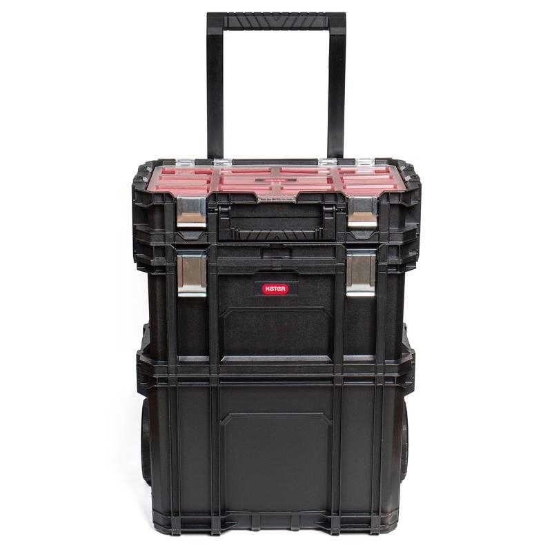 - Модульная система из прочного полипропилена, состоящая из ящика-тележки с объемным отсеком, вместительного съемного ящика для габаритного инструмента и съемного органайзера для мелких деталей, фурнитуры, метизов