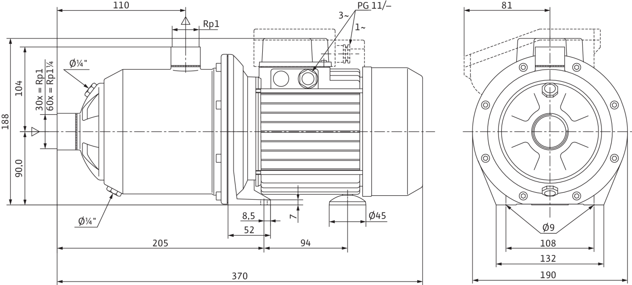 Многоступенчатый нормальновсасывающий горизонтальный высоконапорный центробежный насос блочного типа с низким уровнем шума с горизонтальным всасывающим и вертикальным напорным патрубком. Со сквозным насосным валом электродвигателя и не зависящим от направления вращения скользящим торцовым уплотнением.