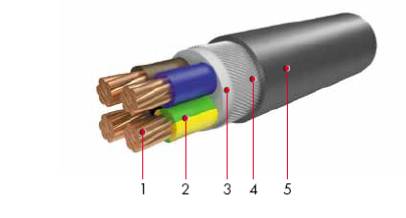 Многожильный медный кабель с изоляцией из сшитого полиэтилена, с броней из стальной проволки, в оболочке из ПВХ.