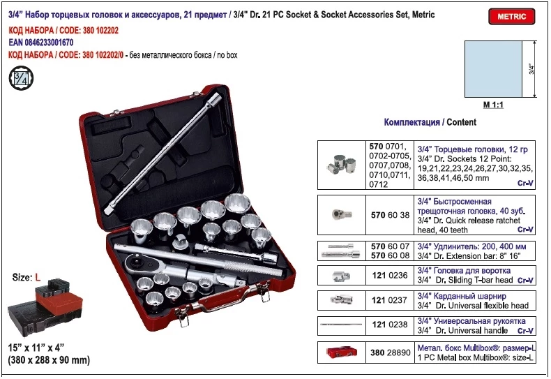 Набор торцевых головок и аксессуаров, метрический, 21 предмет 3/4". Код заказа 380102202