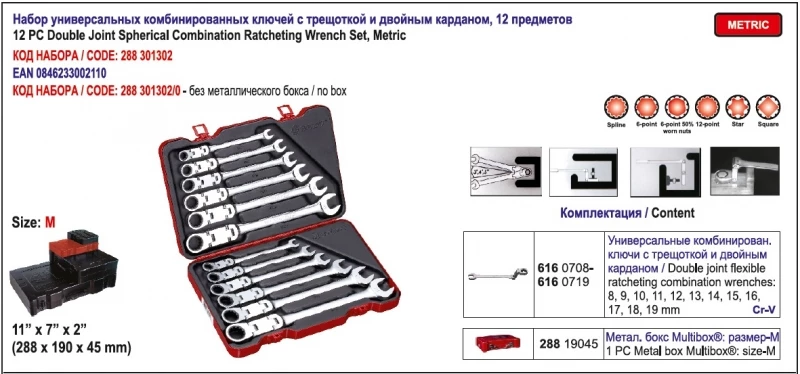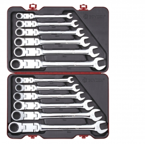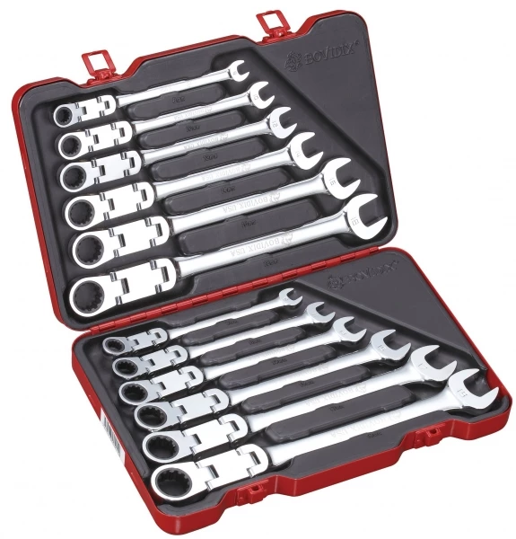 Набор универсальных комбинированных ключей с трещоткой и двойным карданом, метрический, 12 предметов. Код заказа 288301302