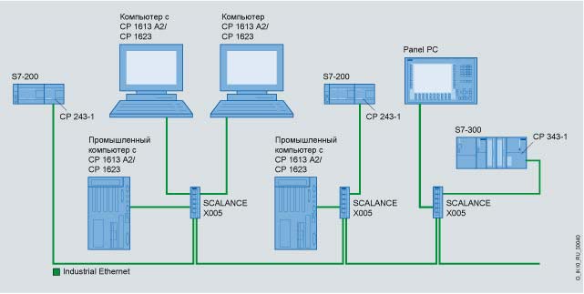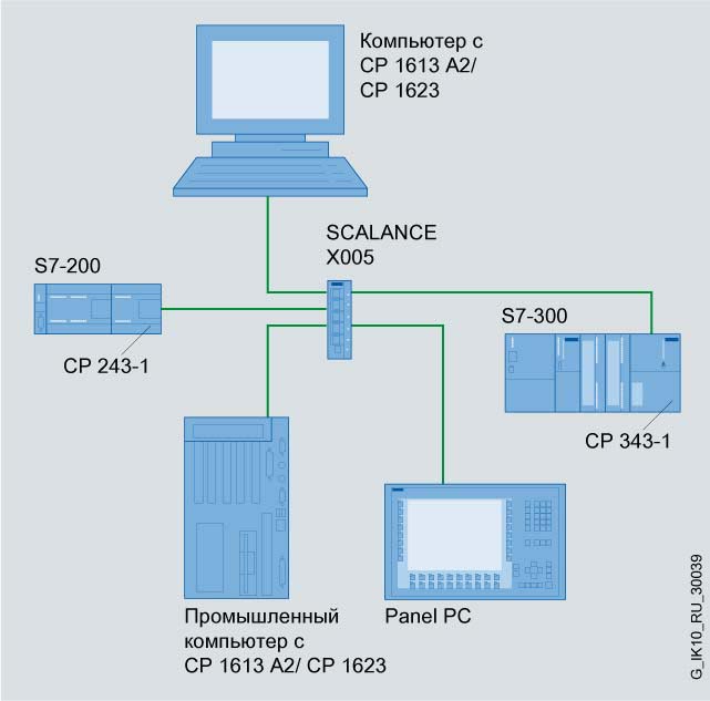 SCALANCE X005 обычно размещается в одном шкафу с соединяемыми узлами. Он может работать в маленьких электрических сетях с линейной или звездообразной топологией. Конфигурация сети может быть легко увеличена, т.к. нет ограничения на каскадирование SCALANCE X005.