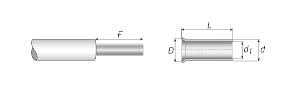 | Наименование | Сечение мм² | Сечение AWG | L(мм) | d(мм) | d₁(мм) | d₂(мм) | F* (мм) |