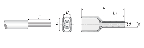 Наименование  Сечение мм²  Сечение AWG L(мм)  L1(мм)  d(мм)  d₁(мм)  A(мм)  B(мм) F* (мм)