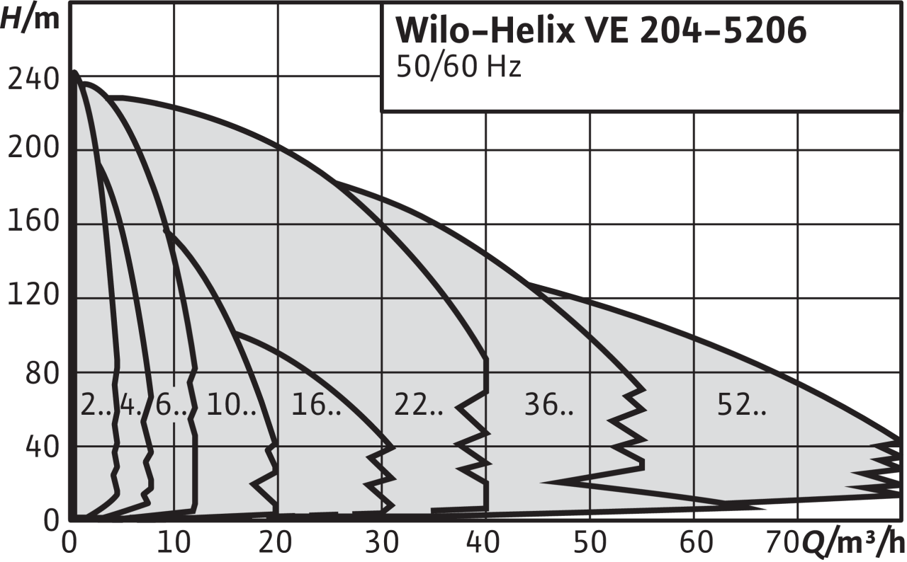 Базовое значение MEI для насосов с оптимальным КПД ≥ 0,70.КПД насоса с откорректированным рабочим колесом, как правило, ниже КПД насоса с полным диаметром рабочего колеса. За счет корректировки рабочего колеса насос настраивается на определенную рабочую точку, в результате чего снижается энергопотребление. Индекс минимальной эффективности (MEI) относится к полному диаметру рабочего колеса.При различных рабочих точках данный насос может работать эффективнее и экономичнее, если, например, управление его работой осуществляется путем регулирования переменной частоты вращения, благодаря которому насос адаптируется к характеристикам соответствующей системы.Информацию по базовому значению эффективности см. на интернет-странице www.europump.org/efficiencycharts.На насосы, потребляющие мощность > 150 кВт, или имеющие подачу QBEP < 6 м3/ч, не распространяются требования по экологическому проектированию водяных насосов. Поэтому значение MEI не указывается.Рабочее поле