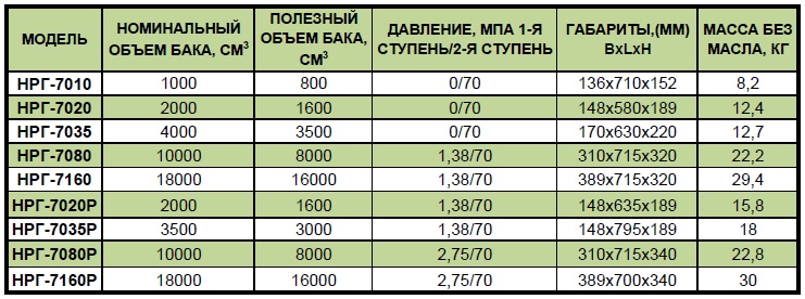 Насосы гидравлические НРГ 7010,НРГ 7020,НРГ7035,НРГ7080, НРГ 7160,НРГ 7020Р,НРГ 7035Р,НРГ 7080Р и НРГ 7160Р предназначены для создания гидравлической энергии и подключения одного или нескольких исполнительных гидроустройств или инструментов.Насосы модели НРГ используются для работы с гидроинструментом одностороннего действия, а модели НРГ****Р - с гидроинструментом двухстороннего действия.Во избежание перегрузок все насосы оснащены предохранительным клапаном, который настраивается на максимальное давление 70 МПа.
