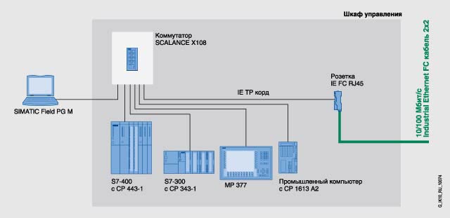 В типовом варианте модуль SCALANCE X 100 устанавливается в один шкаф управления со всеми подключаемыми узлами сети. Все коммутаторы серии позволяют создавать линейные и звездообразные топологии сети Industrial Ethernet с электрическими и оптическими каналами связи.