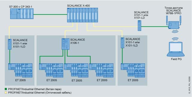 В типовом варианте конверторы SCALANCE X-100 размещаются в одном шкафу управления с подключаемым сетевым узлом. Они могут включаться в линейные, звездообразные и кольцевые сетевые структуры.