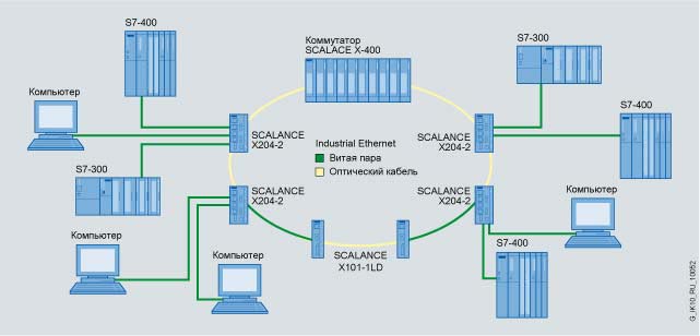 Электрическое кольцо с оптической вставкой, выполненной через конверторы SCALANCE X101-1 или SCALANCE X101-1LD