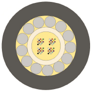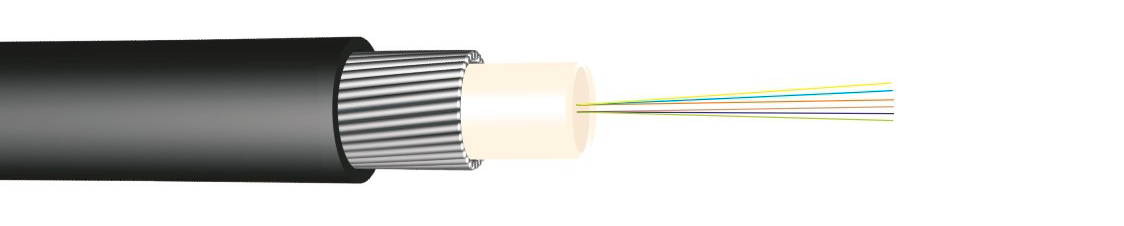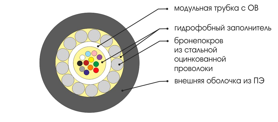 Данная конструкция кабеля состоит из полимерного сердечника — модуля. Внутри оптического модуля может быть расположено до 48 оптических волокон. Свободное пространство внутри оптического модуля заполнено гидрофобинолом. Поверх сердечника накладывается броня из стальных оцинкованных проволок. Свободное пространство между модулем и элементами бронепокрова заполняется гидрофобинолом. Поверх проволочной брони накладывается оболочка из полиэтилена высокой плотности. В случае изготовления кабеля с повышенными требованиями по пожарной безопасности оболочка кабеля выполнена из безгалогенного негорючего компаунда.При количестве волокон более 12 для идентификации используется кольцевая покраска и/или группирование в пучки с помощью идентификационных нитей.