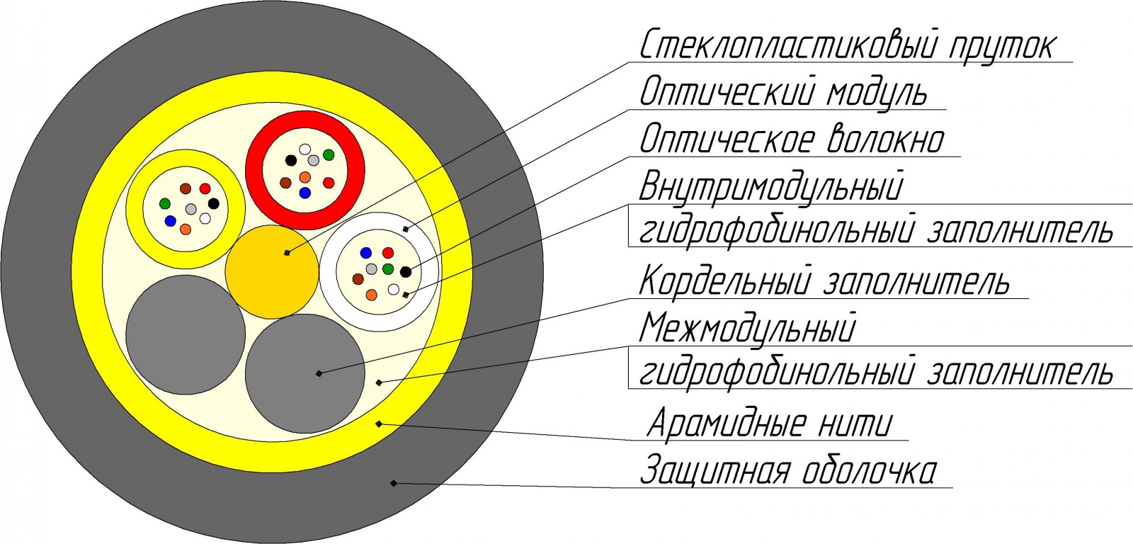 Кабель содержит сердечник модульной конструкции с центральным силовым элементом из стеклопластикового прутка, вокруг которого скручены (модули и кордели) методом правильной знакопеременной (SZ) скрутки. Внутри оптических модулей свободно уложены оптические волокна. Свободное пространство внутри оптических модулей и межмодульное пространство заполнено гидрофобным заполнителем. Сердечник скреплен нитями. На сердечник наложена ПЭТ лента, закрепленная нитью. Поверх скрутки наложен армирующий повив из арамидных нитей. Защитная оболочка – полиэтилен высокой плотности.
