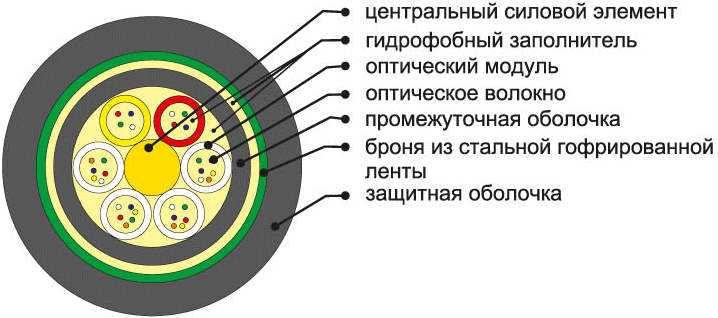 Кабель содержит сердечник модульной конструкции с центральным силовым элементом из стеклопластикового прутка, вокруг которого скручены оптические модули методом правильной SZ-скрутки. Внутри оптических модулей свободно уложены оптические волокна. Свободное пространство внутри оптических модулей и межмодульное пространство заполнено гидрофобным заполнителем. Сердечник скреплен нитями. На сердечник наложена ПЭТ-лента, закрепленная нитью. Поверх сердечника накладывается промежуточная оболочка из полиэтилена. Поверх оболочки накладывается броня из стальной гофрированной ламинированной ленты. Свободное пространство между лентой и промежуточной оболочкой заполняется гидрофобным компаундом. Поверх ленточной брони накладывается полиэтилен высокой плотности. В случае изготовления кабеля с повышенными требованиями по пожарной безопасности оболочка кабеля выполняется из безгалогенного негорючего компаунда.