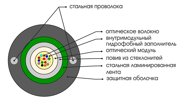 Данная конструкция кабеля состоит из оптической модульной трубки натурального цвета. Внутри оптической трубки может располагаться от 2 до 48 оптических волокон. Трубка заполнена гидрофобинолом. На оптическую трубку наложен армирующий повив из стеклонитей, поверх которых наложена стальная лента с двухсторонним ламинированным покрытием. Защитная оболочка выполнена из полиэтилена высокой плотности. В оболочке кабеля диаметрально противоположно расположены две стальные проволоки, которые выполняют функции силовых элементов. В случае изготовления кабеля с повышенными требованиями по пожарной безопасности оболочка кабеля выполняется из безгалогенного негорючего компаунда. При количестве волокон более 12 для идентификации используется кольцевая покраска и/или группирование в пучки с помощью идентификационных нитей.