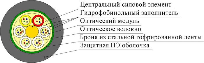 Кабель содержит сердечник модульной конструкции с центральным силовым элементом из стеклопластикового прутка, вокруг которого скручены оптические модули методом правильной SZ-скрутки. Внутри оптических модулей свободно уложены оптические волокна. Свободное пространство внутри оптических модулей и межмодульное пространство заполнено гидрофобным заполнителем. Сердечник скреплен нитями. На сердечник наложена ПЭТ-лента, закрепленная нитью. Поверх сердечника накладывается броня из стальной гофрированной ламинированной ленты. Свободное пространство между лентой и сердечником заполняется гидрофобным компаундом. Поверх ленточной брони накладывается полиэтилен высокой плотности. В случае изготовления кабеля с повышенными требованиями по пожарной безопасности оболочка кабеля выполняется из безгалогенного негорючего компаунда.