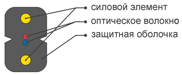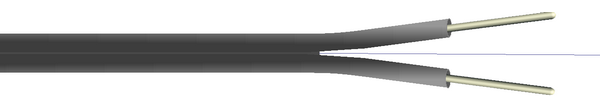 Кабель содержит одно, два или четыре оптических волокна, соответствующих рекомендации G.657A1 (одномодовое волокно не чувствительное к потерям на макроизгибе). Наружная оболочка изготовлена из не распространяющего горение безгалогенного материала — (Halogen Free). Устойчивость кабеля к продольному растяжению придают два стеклопластиковых прутка/ две стальных проволоки)
