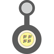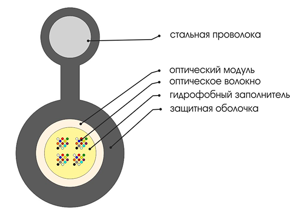 В данной конструкции несущий элемент – стальная проволока, расположен продольно к сердечнику. Сердечник представляет собой оптическую модульную трубки натурального цвета. Внутри оптической трубки может располагаться от 2 до 48 оптических волокон. Трубка заполнена гидрофобинолом. Поверх сердечника и несущего элемента одновременно накладываются оболочки из полиэтилена высокой плотности, соединенные вдоль общей образующей перемычкой. При количестве волокон более 12 для идентификации используется кольцевая покраска и/или группирование в пучки с помощью идентификационных нитей.