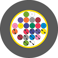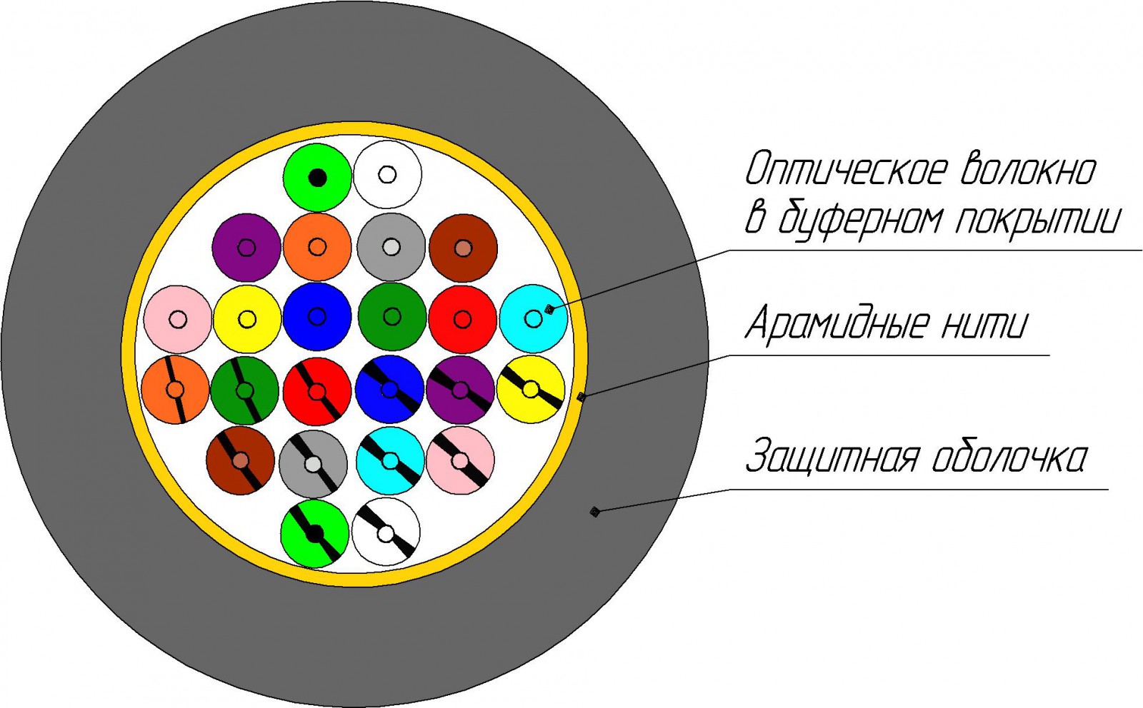 Внутриобъектовый волоконно-оптический кабель с оптическими волокнами в буферном покрытии и упрочняющими арамидными нитями. Кабель может содержать до 24 оптических волокон в буферном покрытии 900 мкм. Поверх ОВ в буферном покрытии наложены упрочняющие арамидные нити. Защитная оболочка из материала, не поддерживающего горение с пониженным дымовыделением. Конструкция полностью сухая.