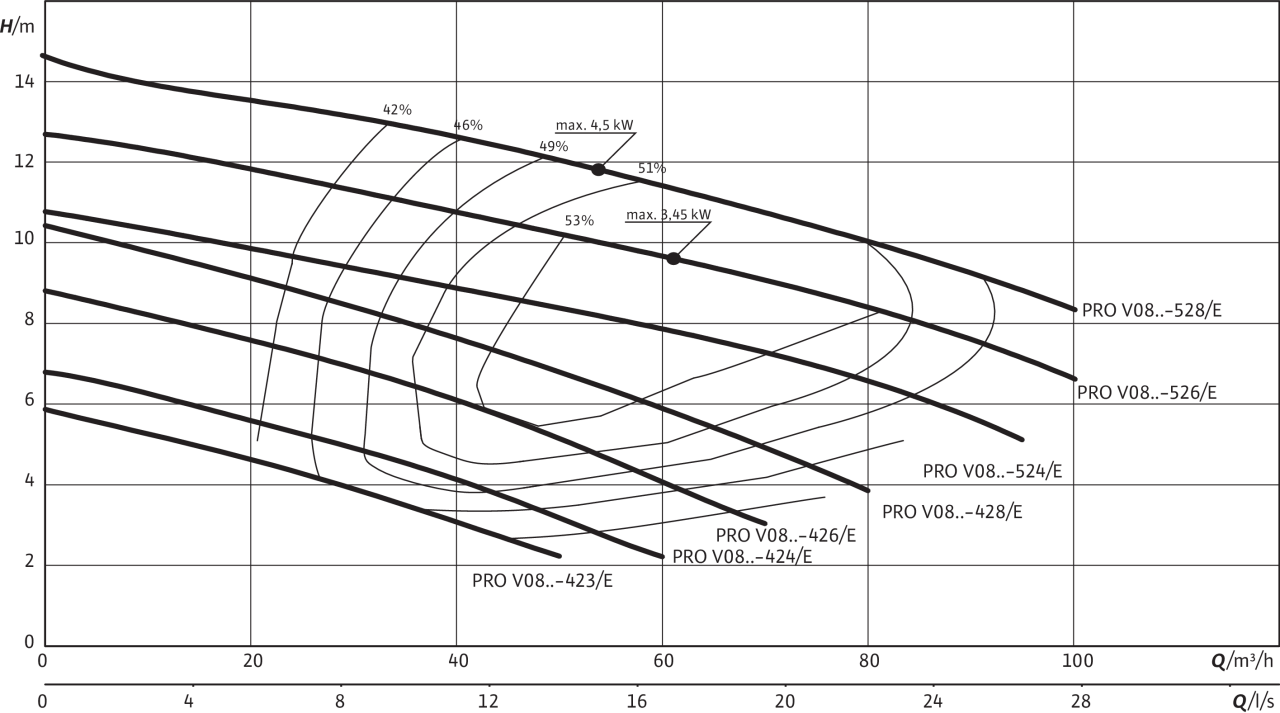 Технический паспорт Характеристики Wilo-Rexa PRO V08-42../V08-52.. - 50 Гц - Число полюсов: 4 Характеристики согласно ISO 9906, приложение A. Указанный коэффициент полезного действия соответствует гидравлическому коэффициенту полезного действия. Агрегат...