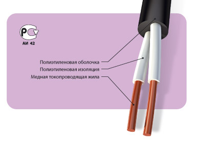 Токопроводящие жилы из медной проволоки с полиэтиленовой изоляцией и оболочкой уложены параллельно. При прокладке кабеля тяговое усилие не должно быть более: 25 кгс — для кабеля с диаметром токопроводящей жилы 0,9 мм; 30 кгс — для кабеля с диаметром токопроводящей жилы 1,2 мм.