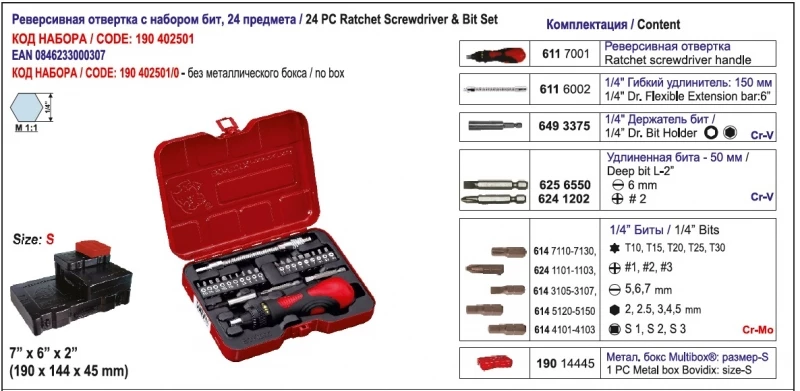 Реверсивная отвертка с набором бит, 24 предмета. Код заказа 190402501