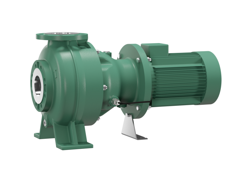 Одноступенчатая центробежная гидравлическая часть со стандартным электродвигателем IEC компактной блочной конструкции для горизонтальной установки в непогруженном состоянии для перекачивания загрязненной воды и неочищенных сточных вод с фекалиями. Гидравлическая часть с аксиальным всасывающим патрубком, радиальным напорным патрубком и подшипниковым узлом в виде законченного блока. Подшипниковый узел с камерами уплотнений и сбора утечек для улавливания поступающей перекачиваемой жидкости посредством уплотнений, расположенных со стороны рабочей среды и со стороны электродвигателя. Гидравлический корпус, рабочее колесо и подшипниковый узел из серого чугуна, уплотнение со стороны перекачиваемой жидкости посредством скользящего торцового уплотнения, не зависящего от направления вращения, уплотнение со стороны электродвигателя посредством радиального манжетного уплотнения. Камера уплотнений дополнительно может контролироваться внешним стержневым электродом. Стандартный электродвигатель IEC в исполнении B5 в виде трехфазного электродвигателя с датчиком контроля температуры обмотки и классом эффективности IE3.