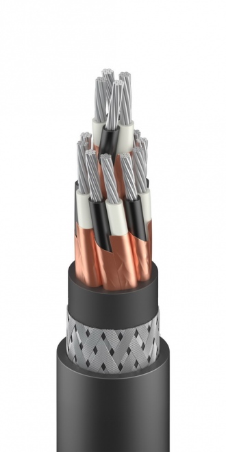 Термоэлектродный кабель с токопроводящими жилами из сплавов, сплава и меди с изоляцией, оболочкой из полимерных материалов, с индивидуально экранированными элементами, с броней в виде оплётки из стальных оцинкованных проволок.