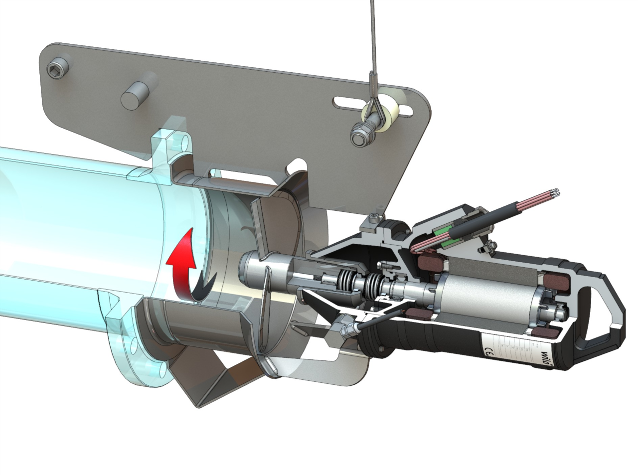1 = гидродинамический корпус, 2 = кабель, 3 = электродвигатель, 4 = устройство контроля герметичности камеры уплотнений (по заказу), 5 = камера уплотнений, 6 = пропеллер