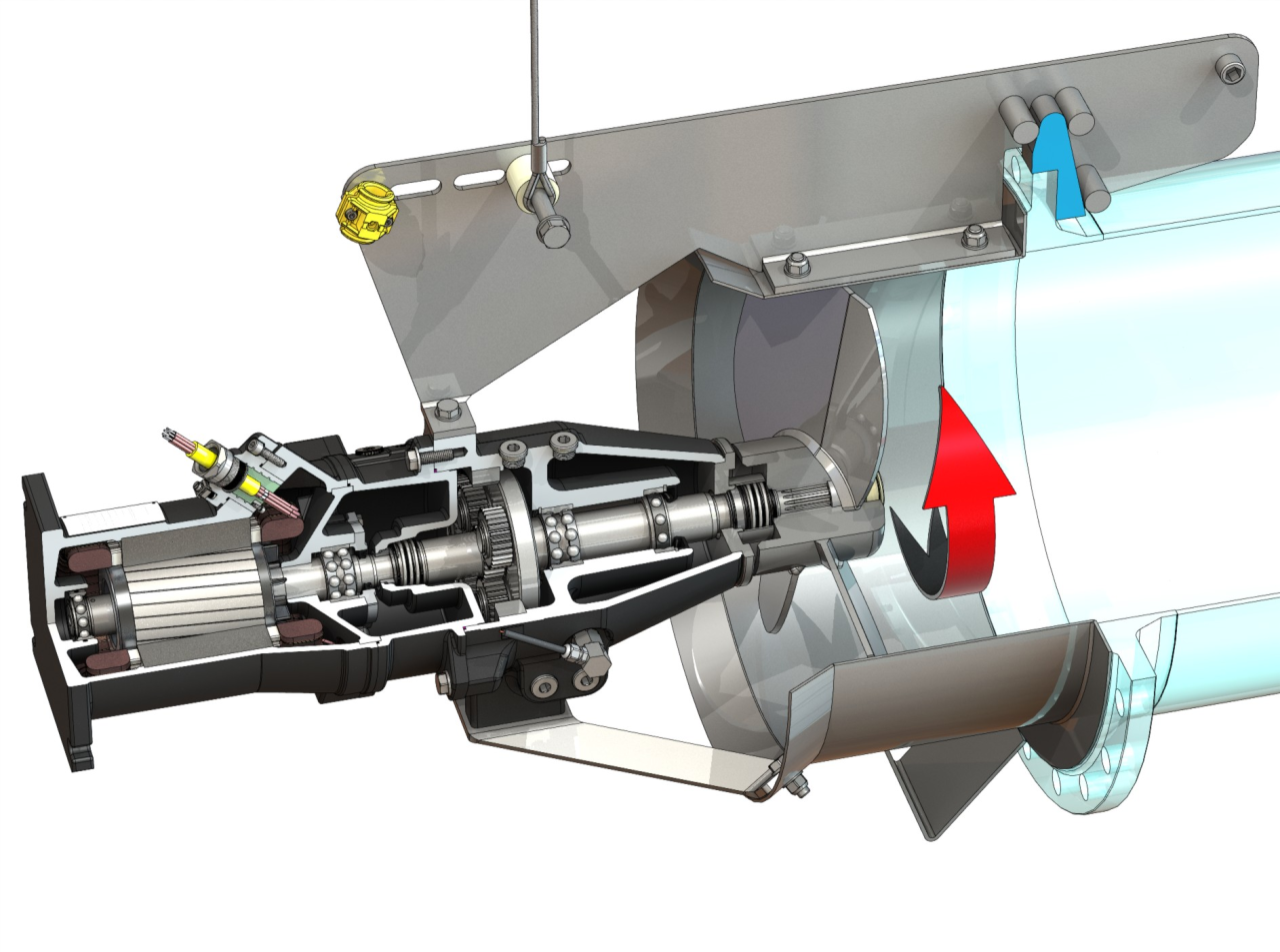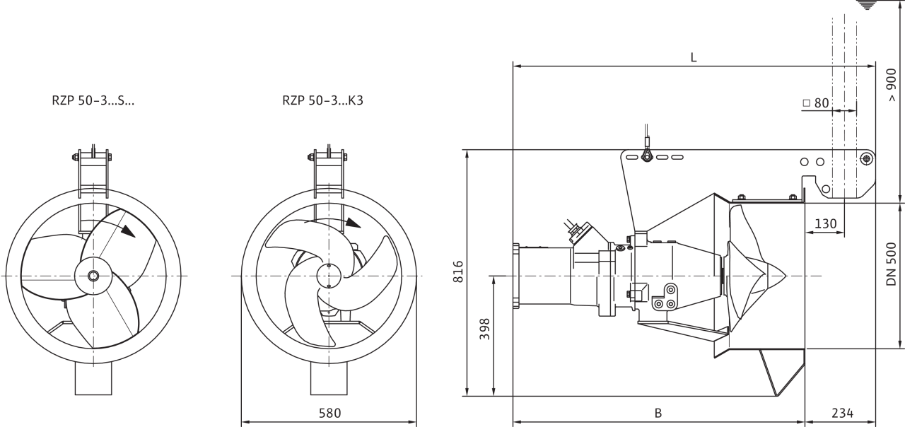 Тип пропеллера3-лопастный пропеллер с самоочищающейся ступицей; изогнут в обратном направлении; благодаря этому защищен от засорения и наматывания
