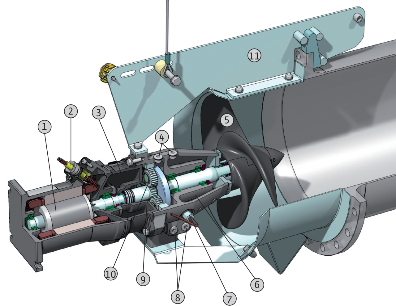 1 = электродвигатель, 2 = кабель, 3 = камера уплотнений, 4= маслоналивные пробки, 5 = пропеллер, 6 = форкамера, 7 = устройство контроля герметичности камеры уплотнений (по заказу), 8 = винт слива масла, 9 = камера редуктора, 10 = планетарный редуктор, 11 = гидродинамический корпус