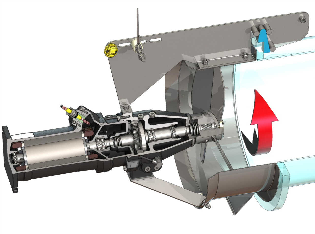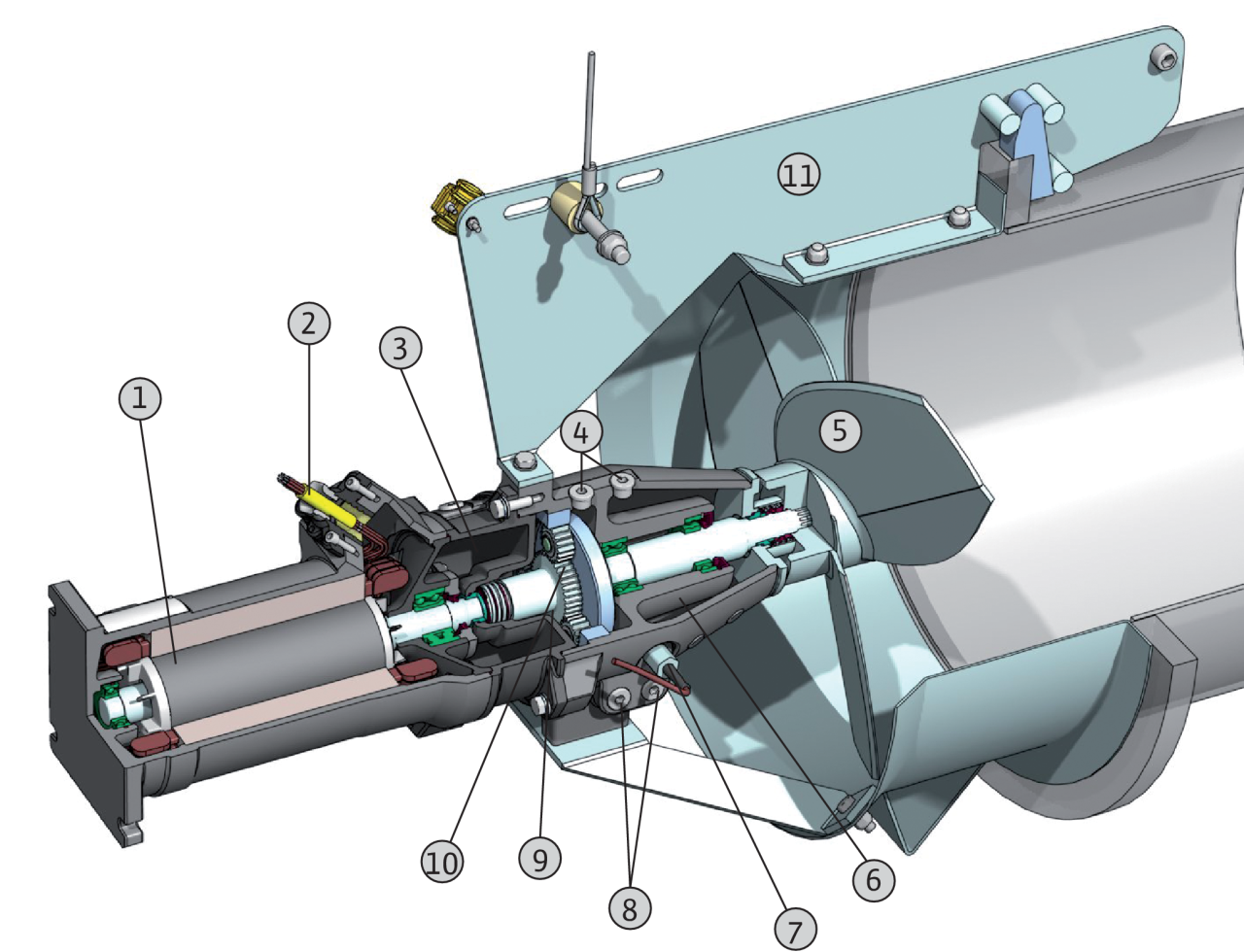 1 = электродвигатель, 2 = кабель, 3 = камера уплотнений, 4= маслоналивные пробки, 5 = пропеллер, 6 = форкамера, 7 = устройство контроля герметичности камеры уплотнений (по заказу), 8 = винт слива масла, 9 = камера редуктора, 10 = планетарный редуктор, 11 = гидродинамический корпус