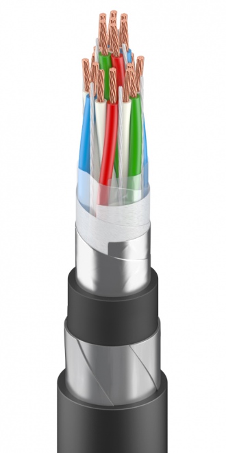 Кабель для сигнализации и блокировки с мягкими медными многопроволочными жилами, с полиэтиленовой изоляцией, с заполнением сердечника водоблокирующими нитями, с поясной изоляцией из ПЭТ-Э плёнки и водоблокирующей ленты, с общим экраном из алюмополимерной ленты, с оболочкой из полиэтилена, с защитным покровом из двух стальных оцинкованных лент и защитного шланга из полиэтилена