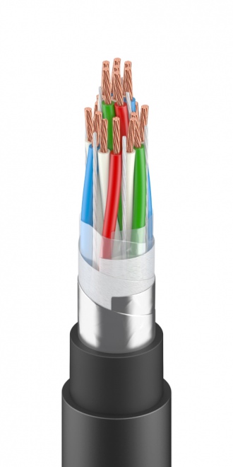 Кабель для сигнализации и блокировки с мягкими медными многопроволочными жилами, с полиэтиленовой изоляцией, с заполнением сердечника водоблокирующими нитями, с поясной изоляцией из ПЭТ-Э плёнки и водоблокирующей ленты, с общим экраном из алюмополимерной ленты, в оболочке из полиэтилена