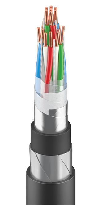 Кабель для сигнализации и блокировки с токопроводящими жилами из мягкой медной проволоки с изоляцией из полимерной композиции, с ВБ элементами, с поясной изоляцией из ПЭТ-Э плёнки; с оболочкой из полимерной композиции, не содержащей галогенов, с защитным покровом, состоящим из 2-х стальных оцинкованных лент и защитного шланга из полимерной композиции, не содержащей галогенов, с общим экраном из алюмофлекса