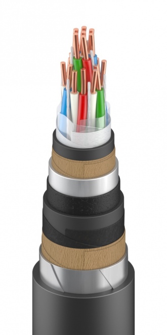 Кабель для сигнализации и блокировки, с медными жилами, с изоляцией из полиэтилена, с водоблокирующими материалами, в алюминиевой усиленной оболочке, с броней из двух стальных лент, в защитном шланге из полиэтилена