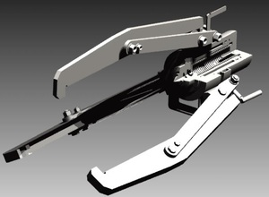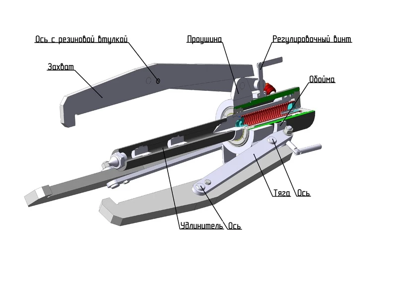 Для стабилизации положения захватов введён трёхзвенный механизм с упругим звеном (захват, тяга, проушина). При этом, тяга с захватом соединена двумя осями, что обеспечивает требуемую жёсткость трёхзвенника.Одна из осей, для компенсации нагрузок соединена с захватом через резиновую втулку. Регулировка по диаметру захватываемой детали осуществляется при помощи винта, перемещающего одновременно захват и тягу на оси проушины. Винт связан подвижно с обоймой,которая установлена на корпусе домкрата.