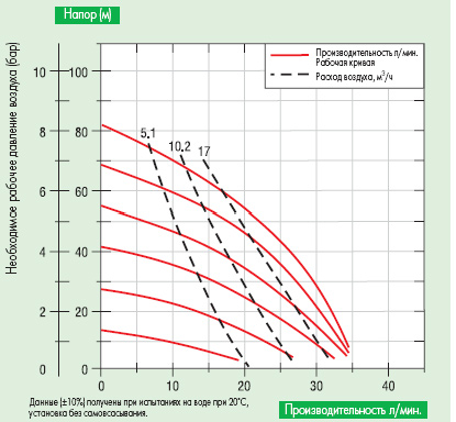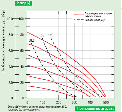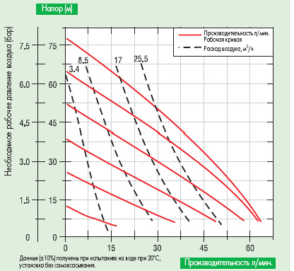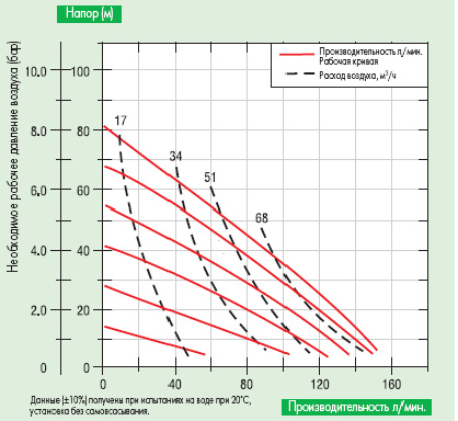 Кривые производительности насосов мембранных (рабочие кривые) для моделей 3/8»