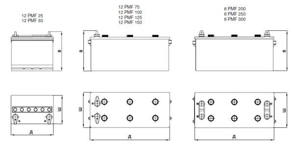 Аккумуляторы FIAMM серии PMF — 6-ти и 12-ти вольтовые блоки, изготовленные по классической технологии с жидким электролитом, что и аккумуляторы OPzS. Емкость блоков от 25 Ач до 300 Ач.