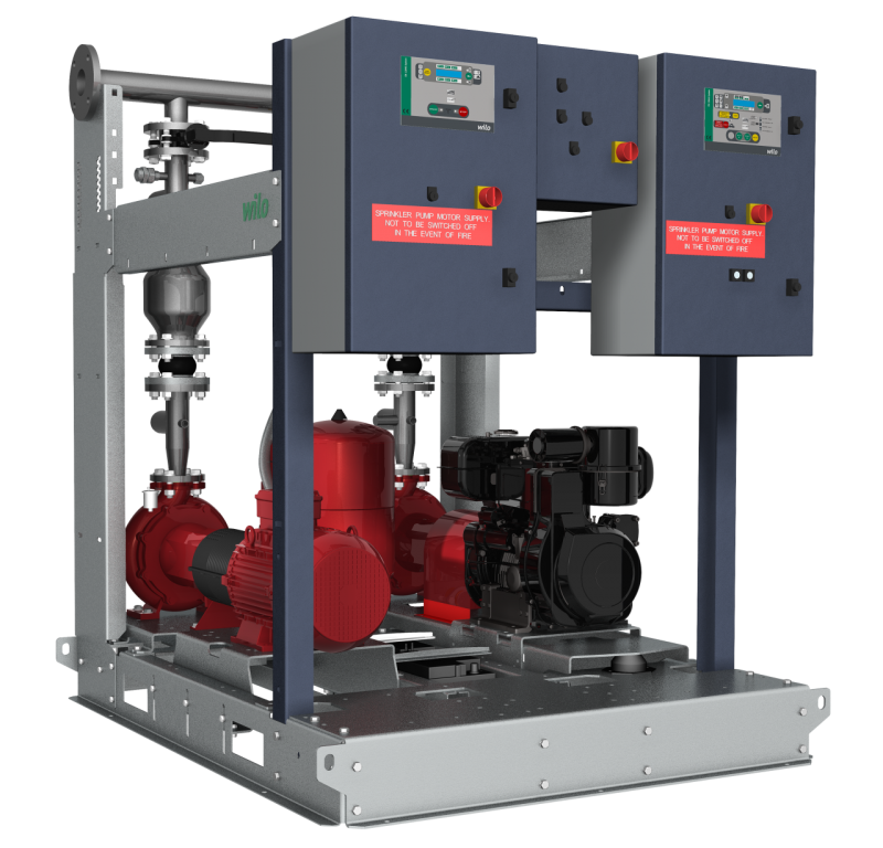Управление насосами с дизельным двигателем, датчиками для контроля насосов и информационным состоянием может осуществляться с помощью блоков управления Wilo EC-Fire D. Управляемый микропроцессором прибор контроля служит для управления и регулировки всех необходимых функций установки повышения давления согласно EN 12845, как во время испытаний, так и во время работы спринклерной системы пожаротушения.